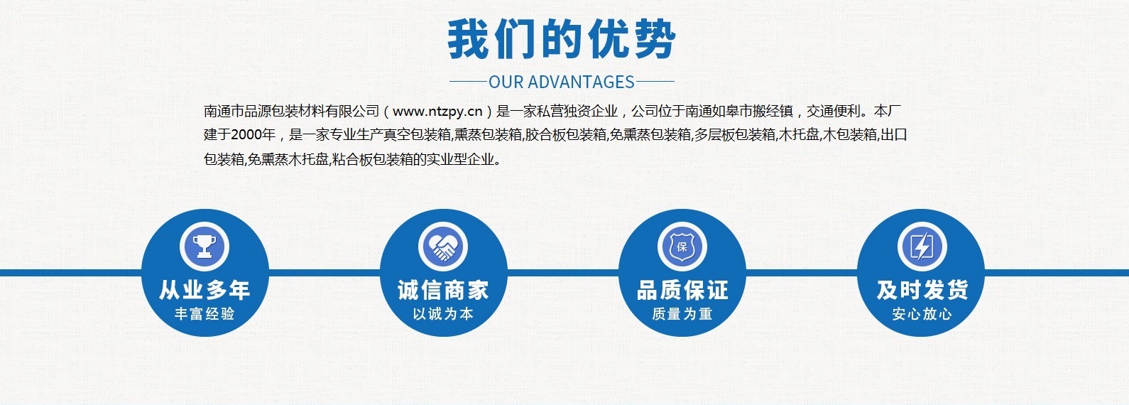 南通市品源包裝材料有限公司(www.xy-fj.com)是一家私營(yíng)獨(dú)資企業(yè),公司位于南通如皋市搬經(jīng)鎮(zhèn),交通便利。本廠(chǎng)建于2000年,是一家專(zhuān)業(yè)生產(chǎn)真空包裝箱,熏蒸包裝箱,膠合板包裝箱,免熏蒸包裝箱,多層板包裝箱,木托盤(pán),木包裝箱,出口包裝箱,免熏蒸木托盤(pán),粘合板包裝箱的實(shí)業(yè)型企業(yè)。